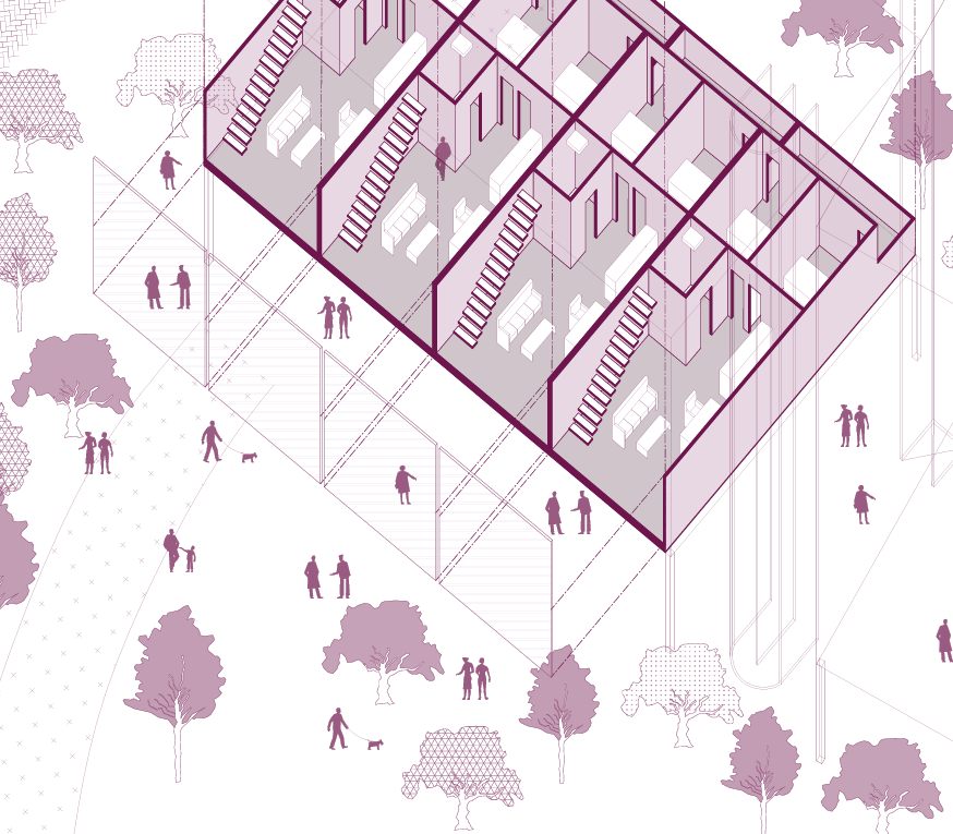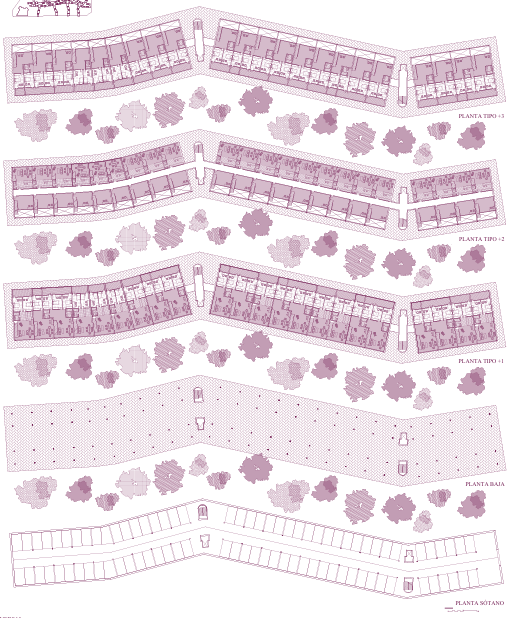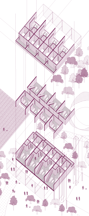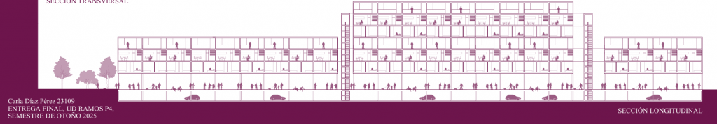 Es a partir de este eje estructurante donde se desarrolla mi proyecto, entendido como una extensión capilar de la rambla hacia el interior del barrio, una operación que traduce la lógica del gran gesto urbano a la escala próxima de lo residencial y lo cotidiano. A través de una serie de ramas secundarias, el proyecto conecta la rambla con las urbanizaciones existentes, disolviendo los límites entre piezas aisladas y construyendo un sistema continuo de recorridos peatonales, espacios verdes y zonas de estancia. Los bloques se elevan sobre planta baja libre mediante pilotes, liberando el plano del suelo y transformándolo en un espacio permeable, atravesable y compartido, donde el peatón recupera protagonismo.