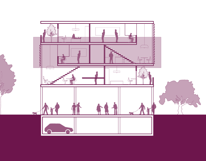 Bajo los edificios, el verde se infiltra y se prolonga, conectando parques, caminos y plazas en una red fluida que invita tanto al paso como a la permanencia. Esta arquitectura no impone recorridos, sino que los sugiere, permitiendo múltiples formas de habitar y atravesar el barrio. La relación con la rambla principal es constante: las ramas no compiten con ella, sino que la alimentan, llevando su actividad, su energía y su carácter cívico al interior del tejido residencial. El resultado es un urbanismo más democrático y accesible, donde el espacio público deja de ser residual para convertirse en soporte de relaciones sociales, encuentros espontáneos y vida comunitaria. En este sistema, arquitectura, paisaje y sociedad se entrelazan para construir un entorno más abierto, más verde y más humano, donde la ciudad ya no se recorre únicamente para llegar, sino para vivirse.
