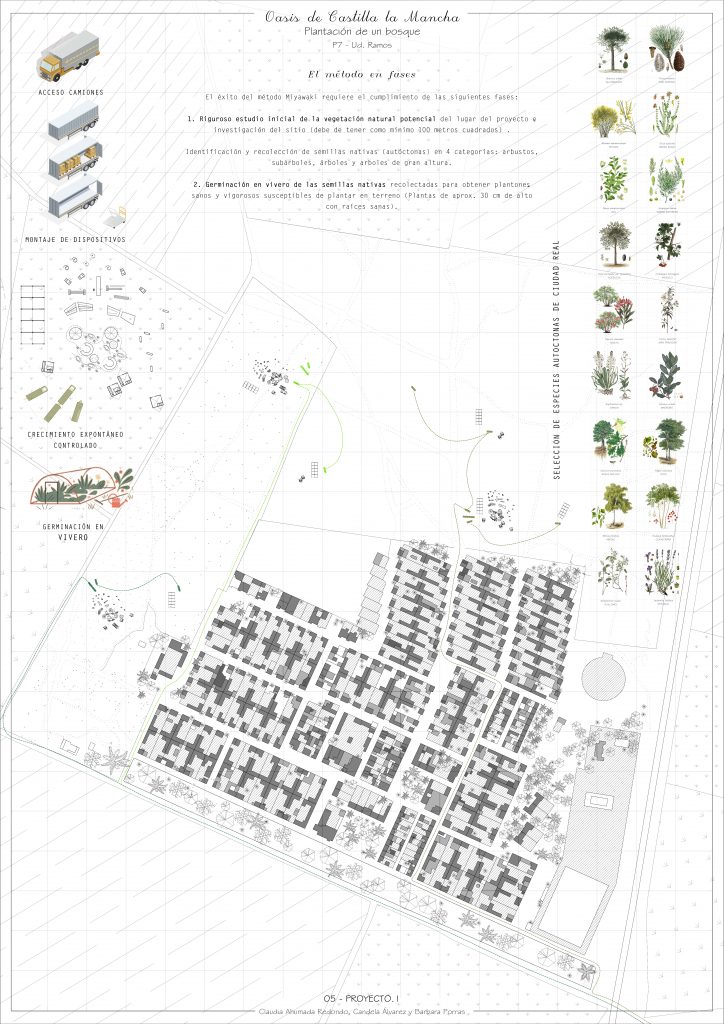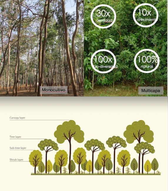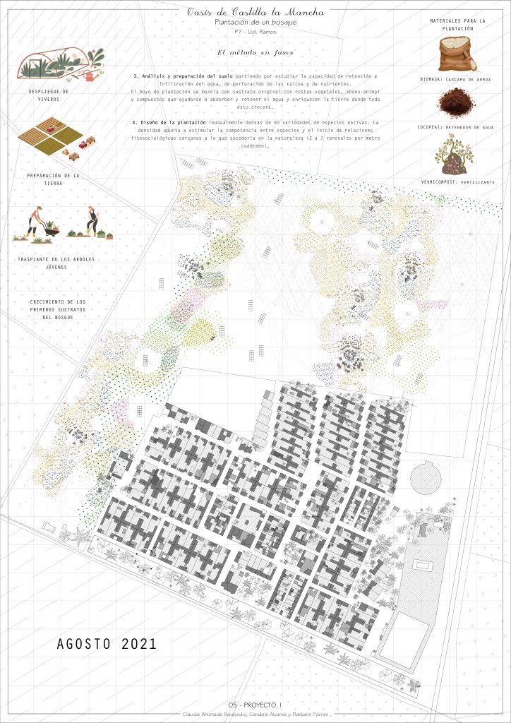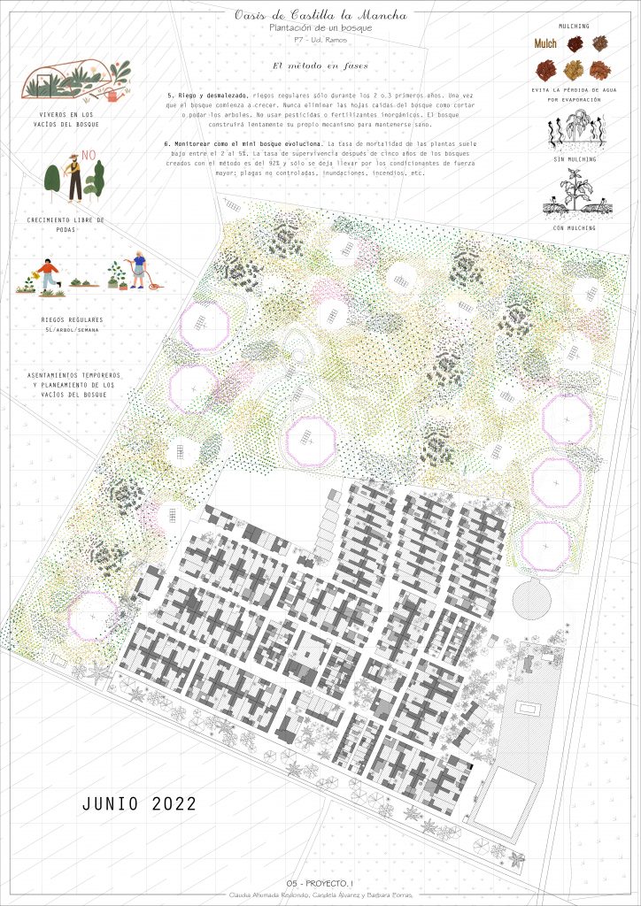 El pilar más importante del proyecto tiene origen en el Método Miyawaki: Un método de reforestación con el que los árboles crecen 10 veces más rápido que los monocultivos. Con él, plantamos un bosque alrededor de Cinco Casas a base de especies autóctonas de la comunidad.