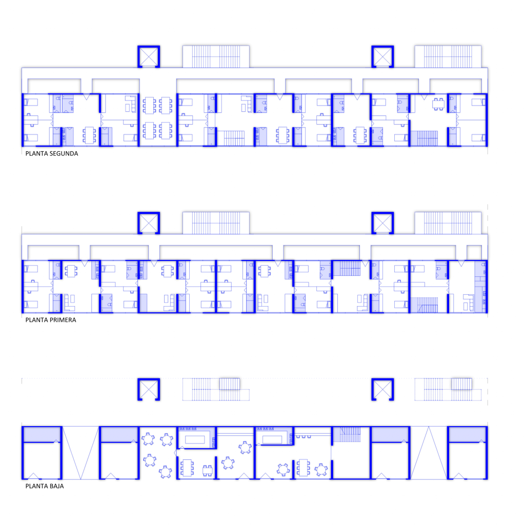 La organización interior de las viviendas se basa en paquetes dispuestos transversalmente a la longitudinalidad del bloque, donde se concentran los servicios (cocinas y baños). Esta estrategia libera las fachadas para los espacios habitables, facilita la repetición modular y permite una mayor claridad en la estructura y en el funcionamiento de las viviendas, reforzando la lógica sistemática del conjunto.