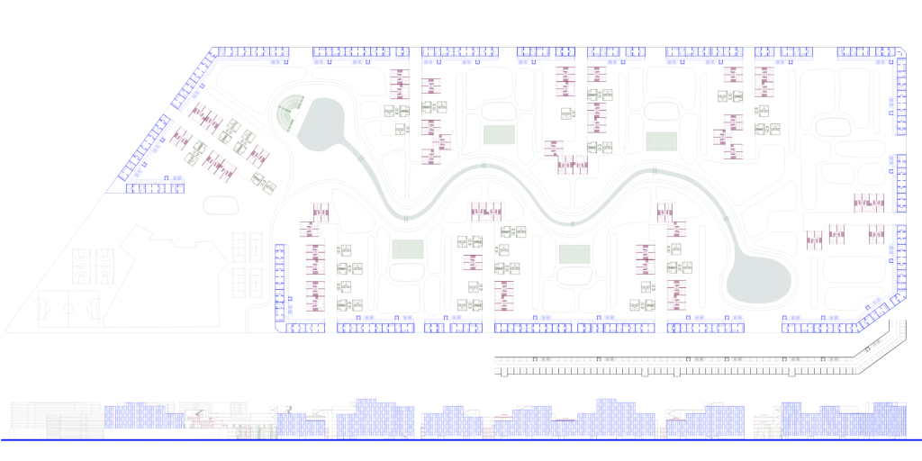 El proyecto se sitúa en una gran parcela en Valdebebas y se desarrolla a partir de un trabajo colectivo en el que tres agentes nos repartimos las escalas S, M y L. Mi intervención corresponde a la escala L, entendida como la encargada de definir la estructura general del conjunto, su implantación en la parcela y la construcción del borde urbano. La propuesta se materializa mediante una serie de bloques longitudinales que cierran casi por completo el perímetro, estableciendo un límite claro entre el exterior y un gran espacio interior de carácter colectivo.