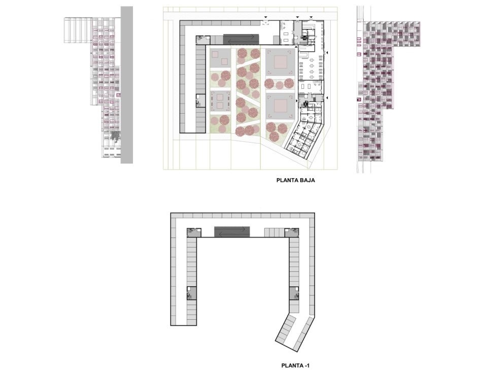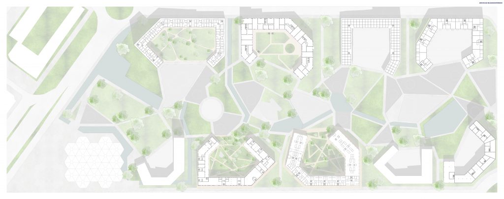 Los edificios se sitúan a lo largo de los lados largos del terreno, creando un gran espacio interior como elemento central del proyecto. Conformado por nueve edificios en forma de U o variaciones de esta, cada uno cuenta con un espacio exterior propio orientado hacia el núcleo central. Inspirado en el proyecto “Robin Hood Gardens”, este espacio interior se convierte en un recorrido visual y social, con colinas, áreas verdes, bosquetes y pequeños cursos de agua que ofrecen múltiples vistas y rutas, además de varios espacios centrales para actividades recreativas y comunitarias.