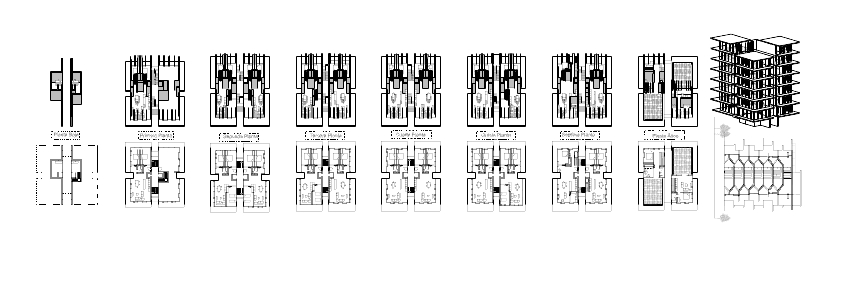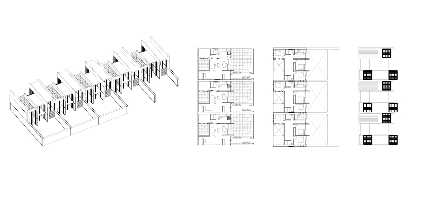 Se proponen cuatro tipologías distintas de vivienda. Dos de ellas constituyen las tipologías mayoritarias y se desarrollan en una única planta, diferenciándose principalmente por su distribución interior. Una de las tipologías cuenta con dos dormitorios y un espacio amplio que integra cocina y salón, mientras que la segunda dispone de tres dormitorios y una zona de estar de menor superficie. En ambos casos, la distribución se diseña priorizando una mayor iluminación en las zonas comunes y una luz más controlada en los espacios privados destinados a dormitorios.