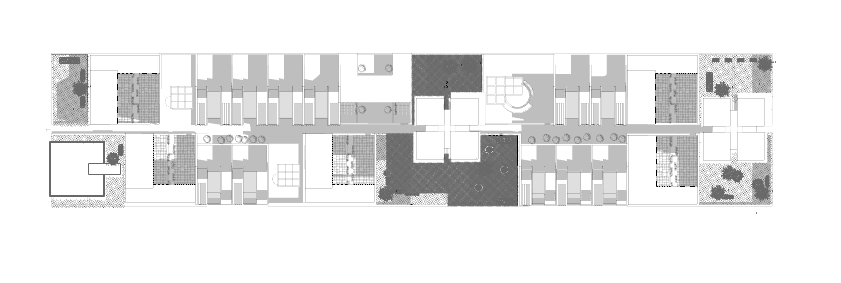 Con el objetivo de aumentar la densidad residencial por hectárea, se implantan sobre las zonas públicas una serie de piezas verticales, liberando prácticamente la planta baja para no interferir en el tránsito público a lo largo del pasillo central que conecta el intercambiador con el hospital. De este modo, la edificación se eleva y permite la continuidad del espacio público a nivel del suelo.