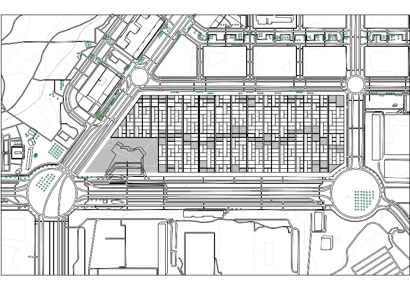 El proyecto plantea la organización de la parcela mediante la división del ámbito en un total de 550 parcelas, dispuestas de forma ordenada de manera que cada dos franjas de parcelas se articula una vía de acceso, generando así una trama regular a modo de parrilla de piezas habitables. Esta estructura se ve reforzada por la incorporación de un pasillo central de carácter público, que actúa como eje principal del ámbito y permite la conexión directa entre el intercambiador y el Hospital Isabel Zendal, consolidándose como un elemento vertebrador del conjunto.