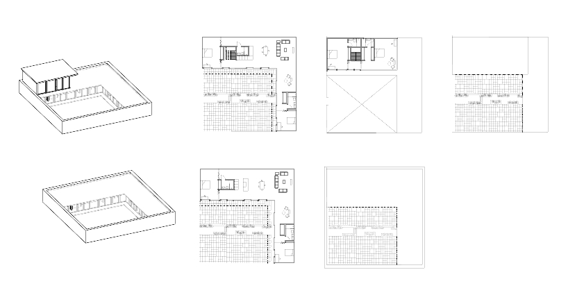 Las viviendas unifamiliares implantadas en parcelas de 20 × 20 metros se proyectan en torno a un espacio central amplio que actúa como elemento organizador de la vivienda. A partir de este espacio principal se articulan las distintas estancias, vinculadas a núcleos situados en los extremos de la casa, lo que permite una organización clara y funcional del programa. La distribución de la vivienda propone un sistema de iluminación natural durante todo el día ya que dispone dos fachadas completamente abiertas al exterior permitiendo la entrada de luz.