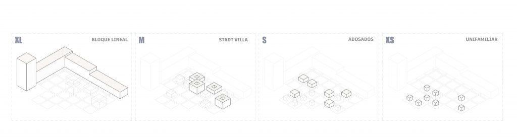 Esta organizado mediante módulos con una cuadrícula que agrupan las distintas tipologías residenciales. La escala pequeña, formada unifamiliares, adosados y las Stadtvilla, es acogida por por la edificación perimetral con los bloques lineales y las torres puntuales, que con mayor altura y densidad dan soporte a la escala pequeña y equilibran el conjunto.