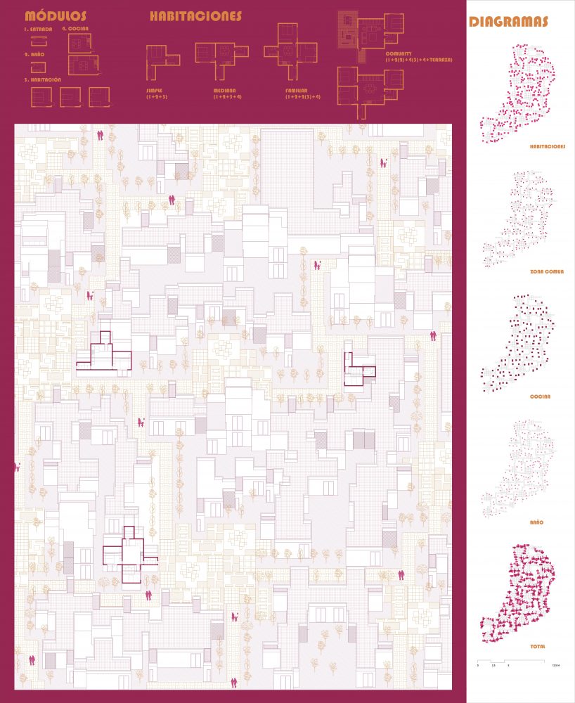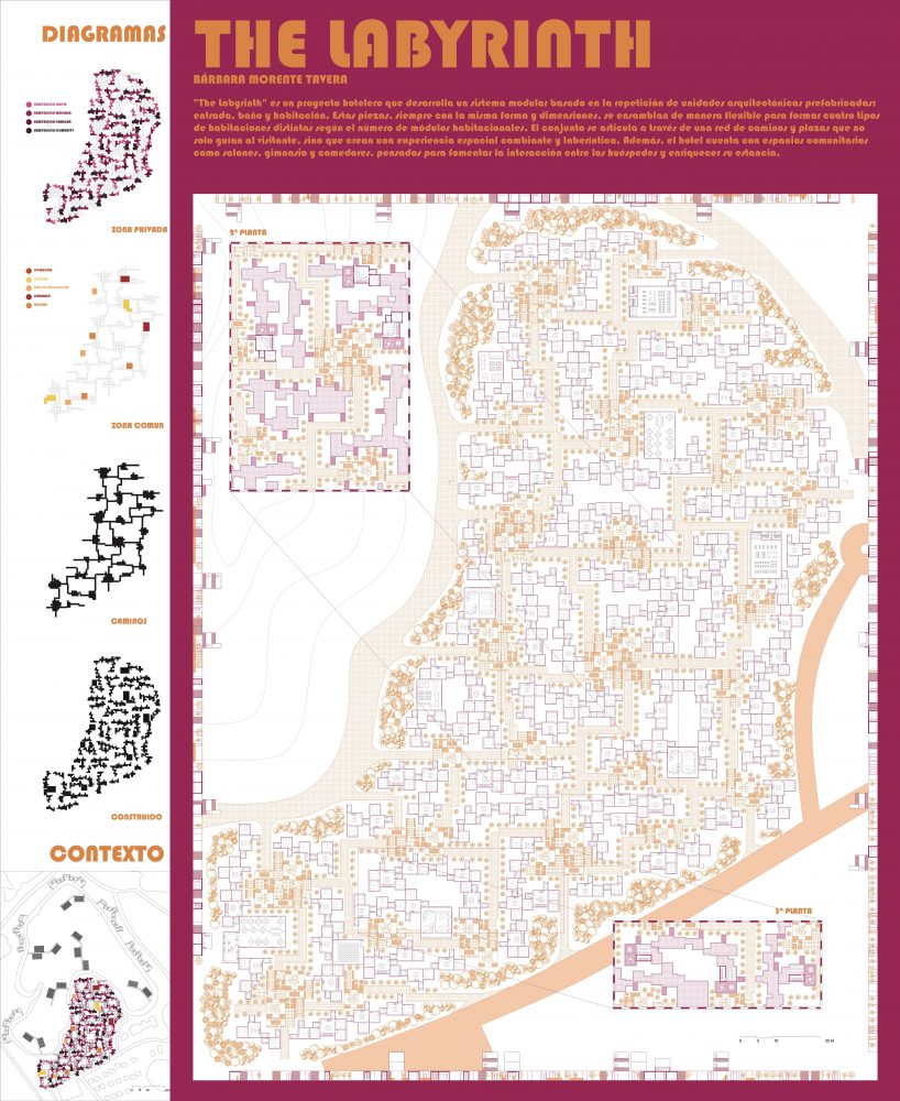 «The labyrinth» es un proyecto hotelero que desarrolla un sistema modular bazado en la repetición de unidades arquitectónicas prefabricadas: entrada, baño y habitación. Estar piezas. siempre con la misma forma y dimensiones. se en/amblan de manera flemible para formar cuatro tipos de habitaciones distintas según el número de módulos habitacionales. El conjunto se articula a través de una red de caminos y plazas que no solo guían al visitante, sino que crean una experiencia espacial cambiante y laberintica. Además. el hotel cuenta con espacios comunitarios como /alones, gimnario y comedores, penzados para fomentar la interacción entre los huéspedes y enriquecer su estancia.