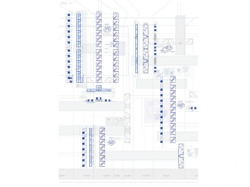 Para sistematizar las uniones se establece una lógica de hileras de viviendas . Se busca la transitabilidad de las cubiertas por un importancia en el carácter funcional.