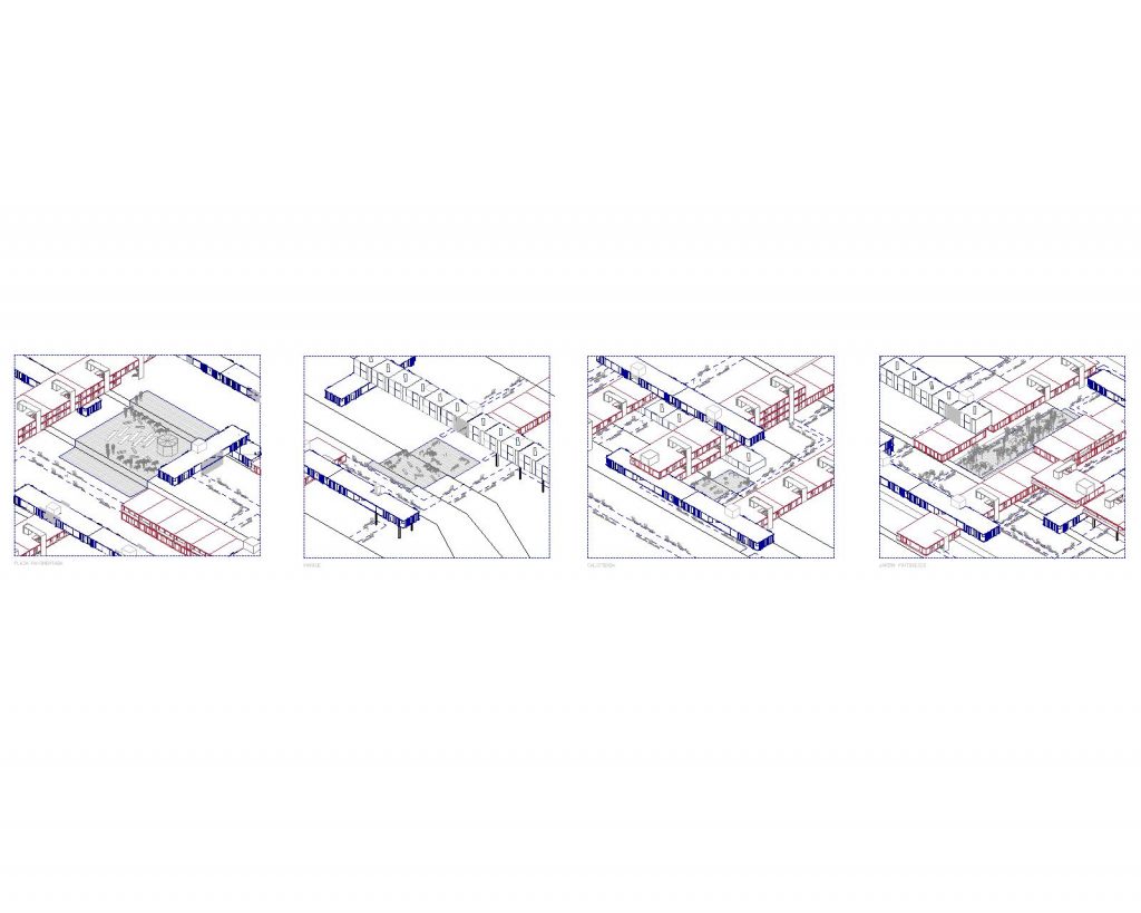 Además, como espacio publico se realizo un estudio de distancias a partir de estos portales, núcleos de comunicación hacia las grandes calles colindantes al solar, para realizar un trama ortogonal neoplasticista que permitía el generar diversas opciones para un mismo terreno.